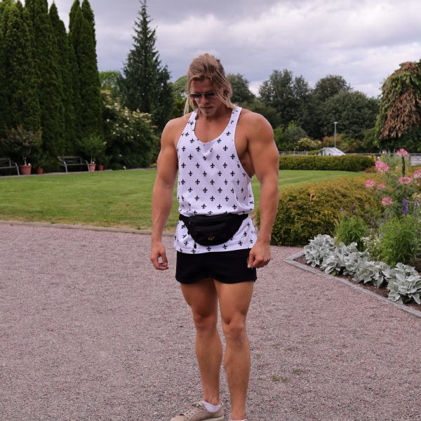 Great fit for the gym. Marcus knows how to design clothes for the muscular build. The back of the stringer displays the lats, helping to show width. Fleur di lis design is spot on.