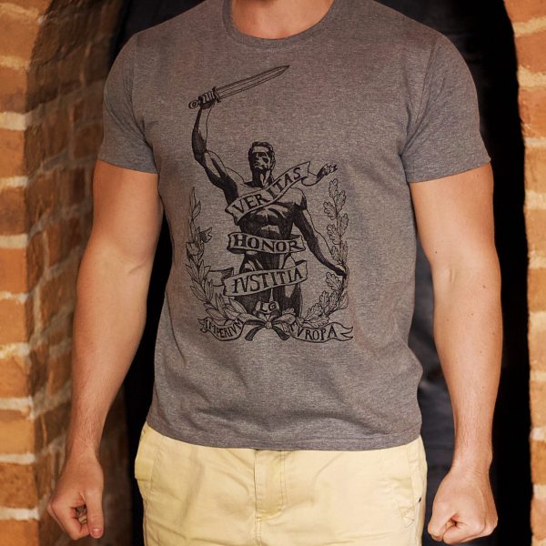 This garment stands for loyalty to Mother Evropa. The use of V instead of U is a nod to the Roman way of spelling. The statue depicted is based upon the works of the German sculptor Arno Breker and the words surrounding the statue; veritas (truth), honor (honour), ivstitia (justice) signifies values that should be upheld.