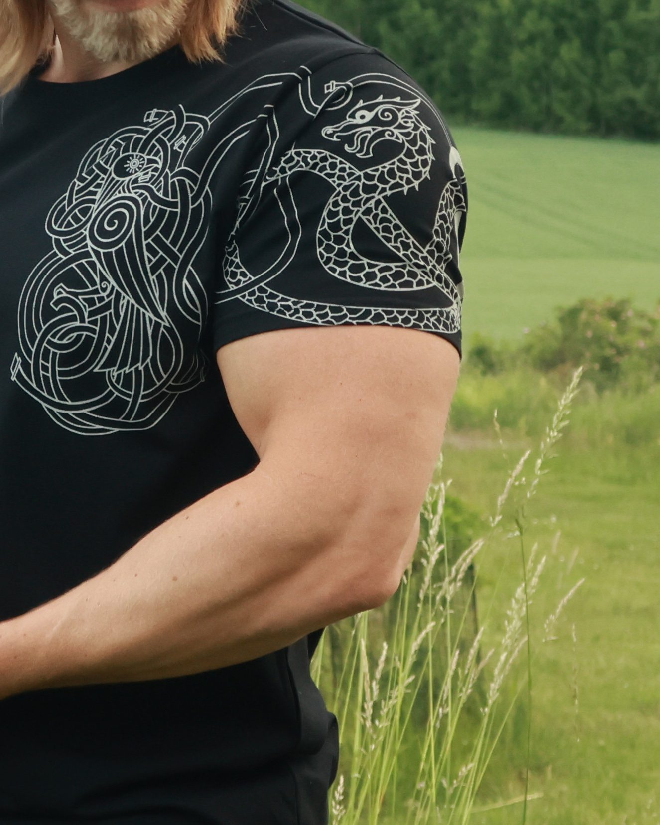 Glad to see a continuation on the historic tattoo motifs on t-shirts! It can’t get much better with both ravens and dragons! Size medium fits great at slightly above 180 cm and 70 kg.
