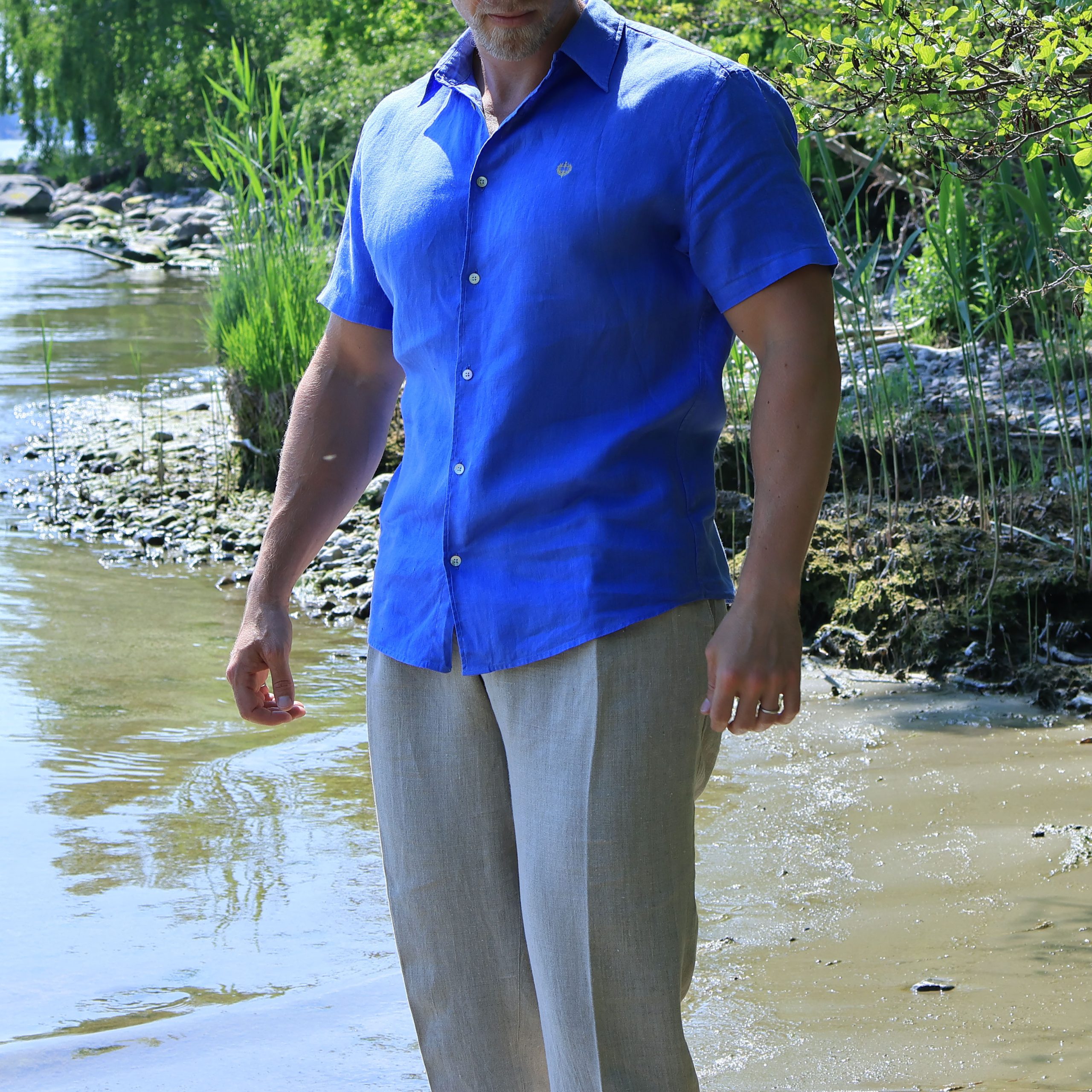 An aesthetically pleasing short-sleeve linen shirt for athletic gentlemen.