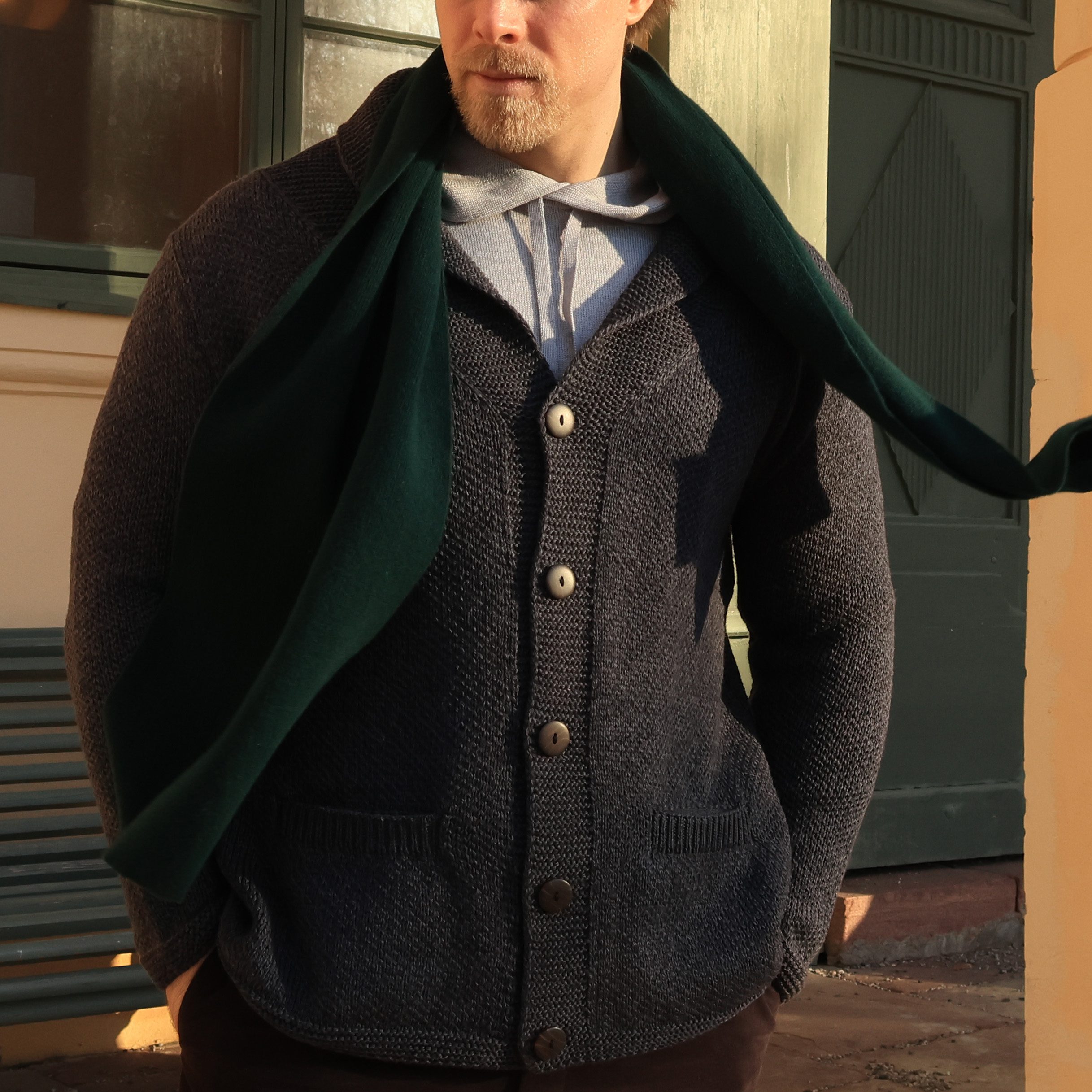 A sensitive poet is out looking for inspiration, longing for the presence of the Muses. The pale sun of early spring or first chill of autumn brings him closer to the mysteries of the universe. Adorned in an aesthetically pleasing and comfortable scarf, he is suddenly hit with divine inspiration.
